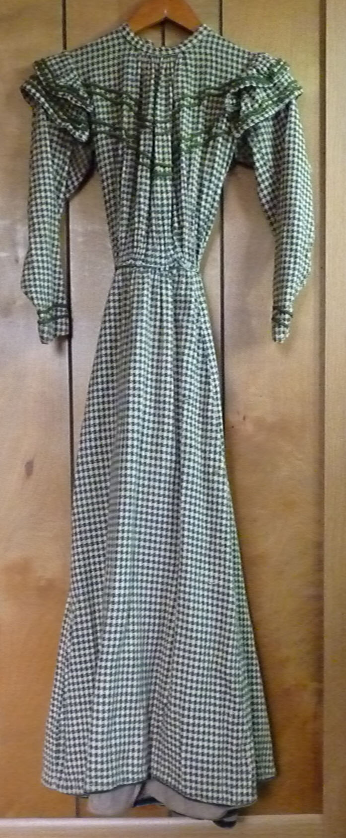 The waist on the dress looks droopy, but when you pull the extra fabric up to waist level, the bodice takes on that “pigeon breast” look that was popular about 1900, so that is my guess on its date.