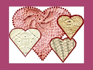 Valentine’s Day brings to mind those great old lacy, beribboned cards. I would love to make my own, but it would take hours, so I decided to scan some of my lace scraps and use those to create cards. (It ended up still taking hours, but at least now I can re-use the scans and designs.)