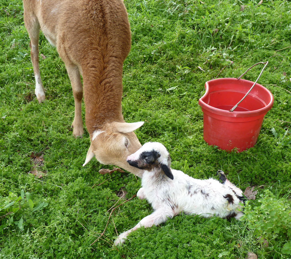 He was born out in the pen with no troubles, but since there are plenty of dogs, coyotes, foxes, and hawks around, I moved mother and baby to a stall in the barn. He and Romy don’t quite have their timing right on feeding yet, so I have been supplementing with bottles. So far he is energetic and interested in everything.