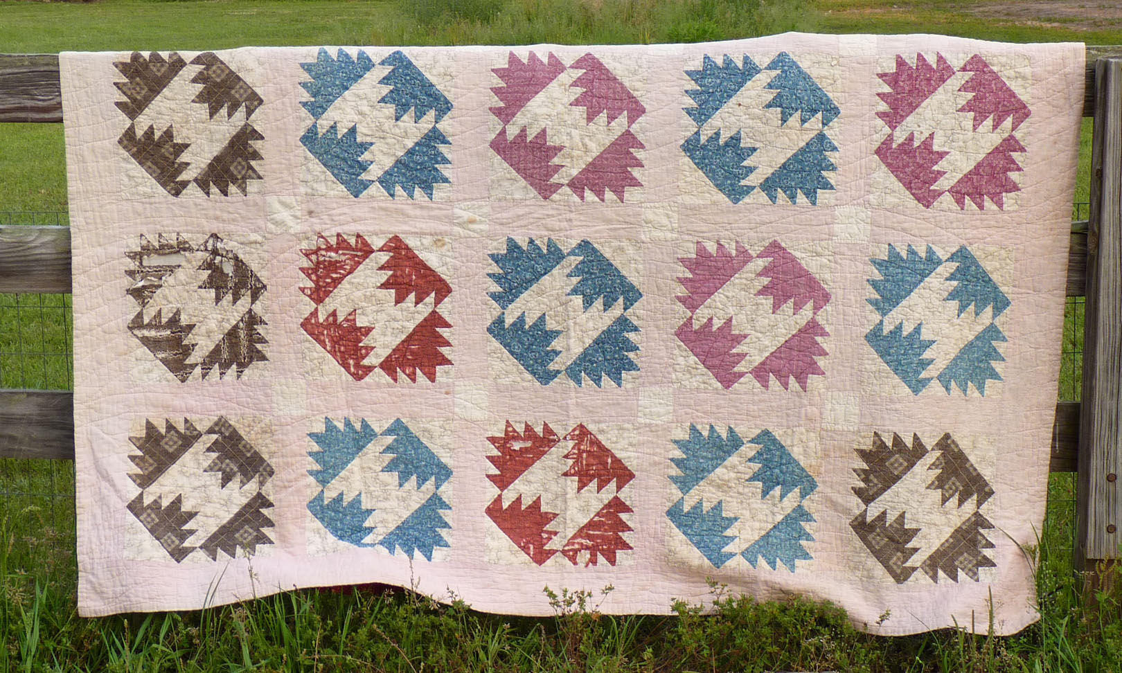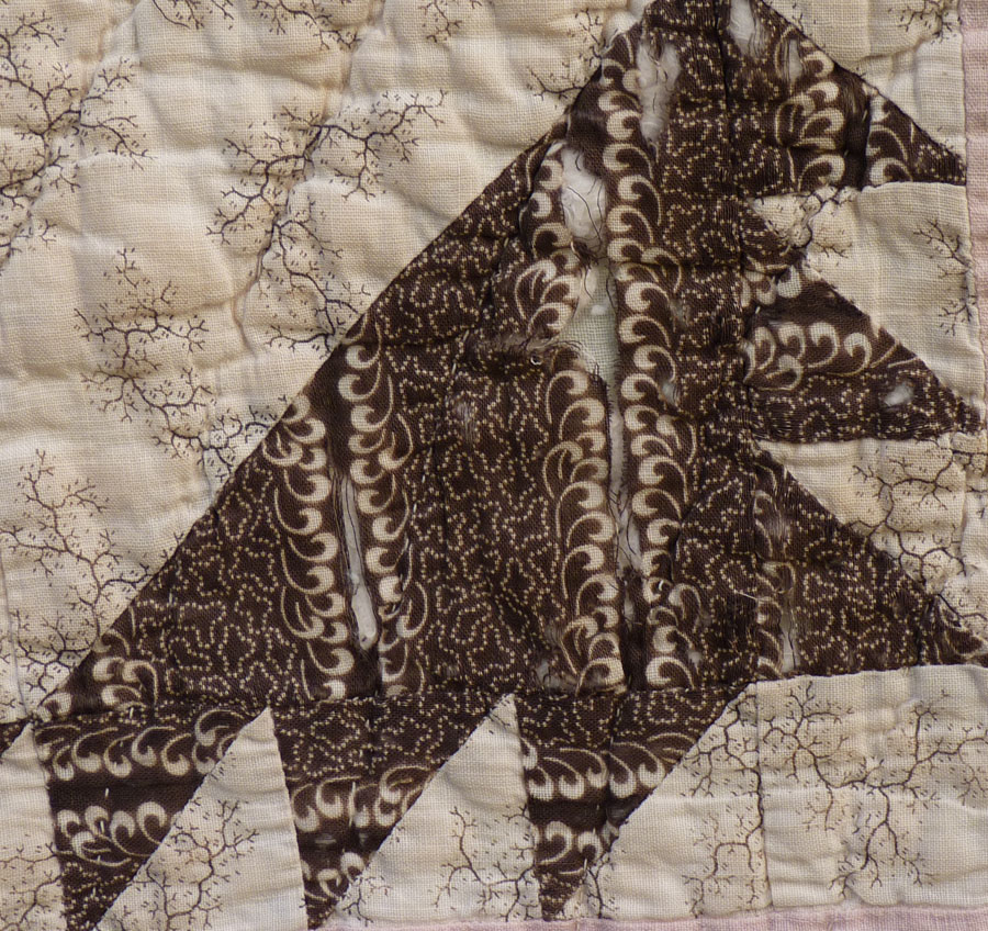 I think this is the oldest quilt I have.  It is in really poor shape, but I love the designs and colors of those old fabrics.  Such rich designs were created from just a few elements.