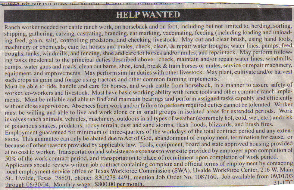 This reminds me of my favorite want ad ever, from my favorite newspaper, The Mohair Weekly. ( I am not making that up.) Someone figured out all the skills a ranch hand actually needs and put them in the ad. Notice the salary offered. The ad is from 2002.