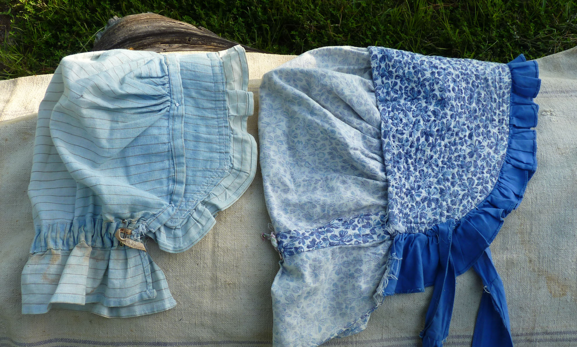 The pale blue sunbonnet has a brim that buttons on with 5 shell buttons. The fabric is either a crisp cotton or linen. The dark blue flowered sunbonnet has a brim that is stiffened by rows of machine stitching. There are at least two layers of fabric, maybe three. All the stitching on both bonnets is machine-done.