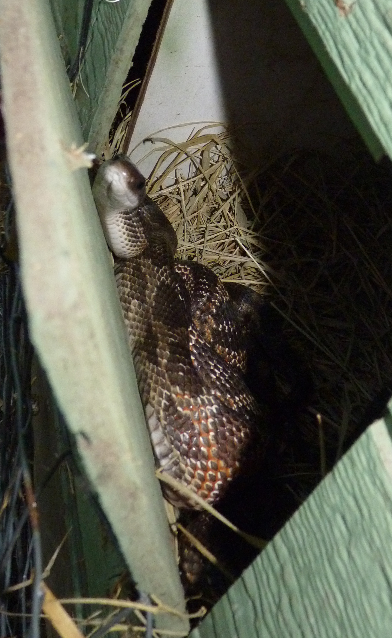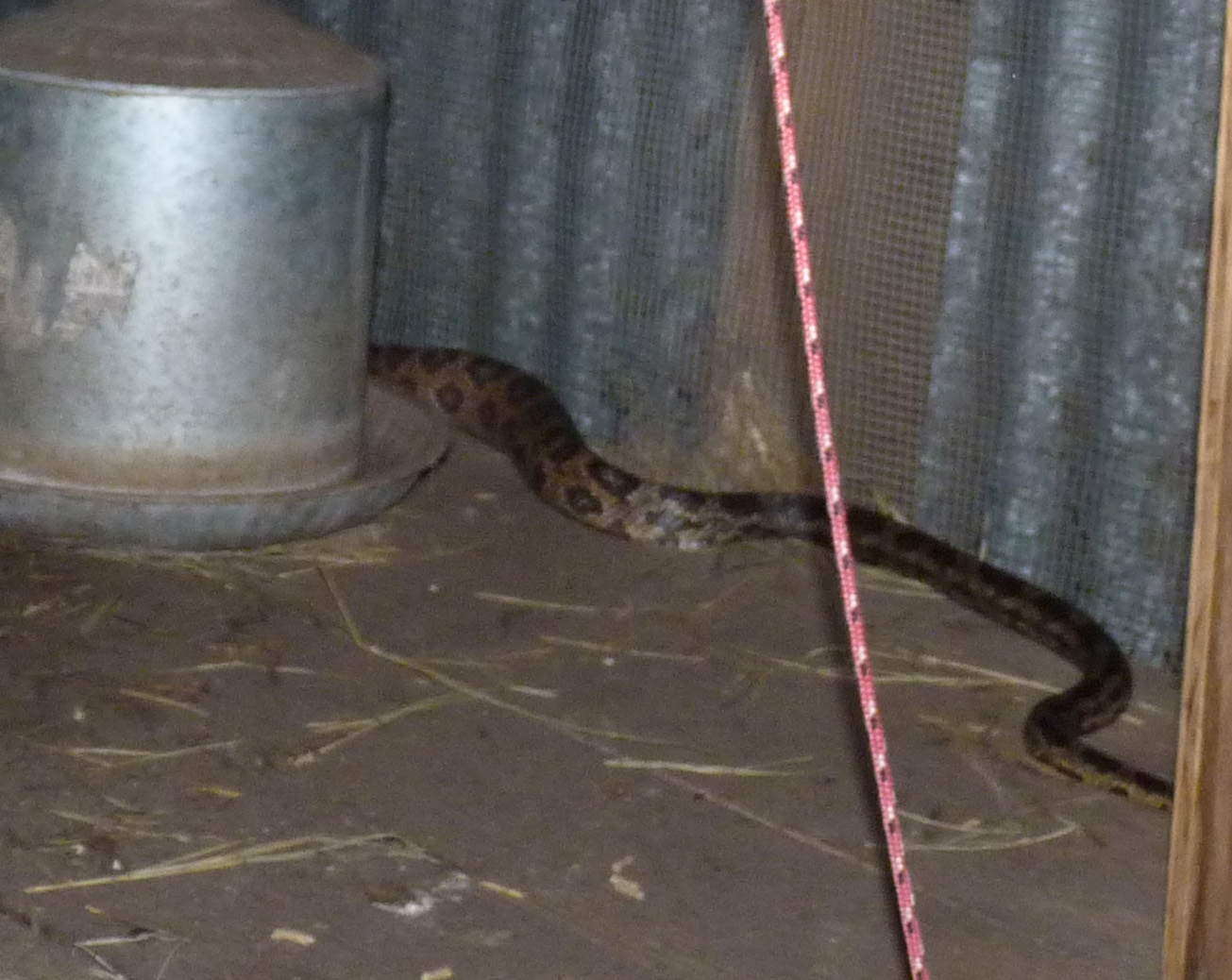 I went up to the chicken coop in the evening, to give the chickens fresh water. I noticed that they were quietly roosting on their outdoor perches an hour before dark, when usually they would still be roaming the ground and clucking. So I alertly checked the coop area before popping open the doors to the nest boxes. And there on the coop floor was Mr. Snake, who did a double-take when he saw me (“What is she doing up here at this hour? I thought I would have the place to myself!”) and then tried very hard to camouflage himself as an integral part of the coop (“OK, all I have to do is just act like a board, and she’ll never even notice me…”)