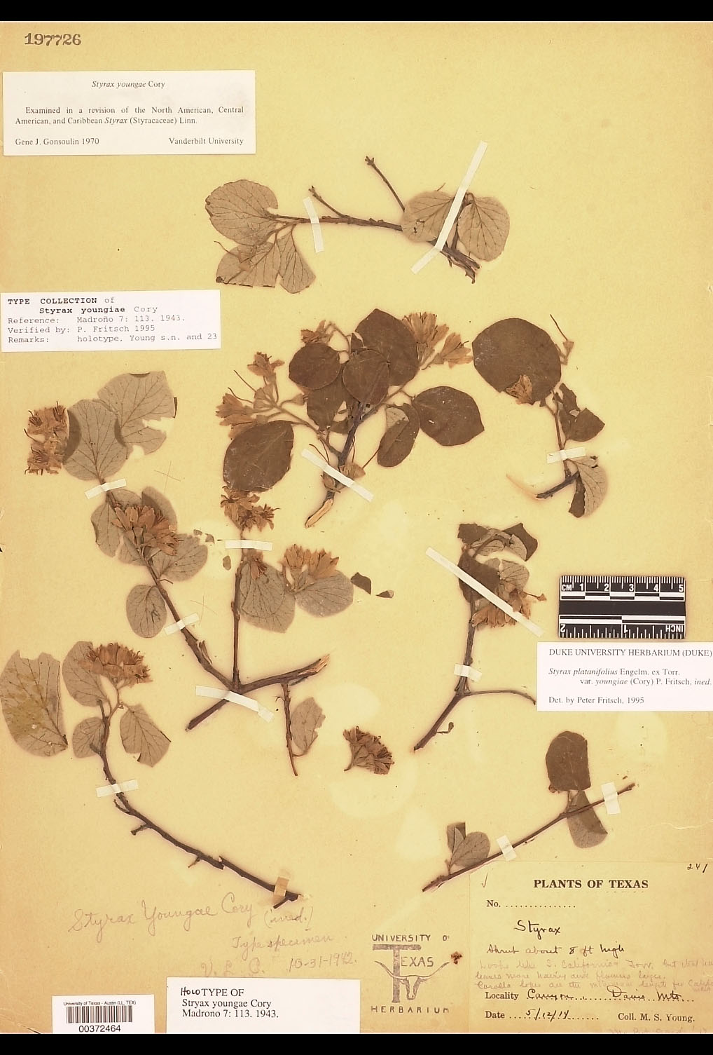 Styrax platafolius, collected by Mary Sophie Young in a canyon of the Davis Mountains on May 12, 1914.