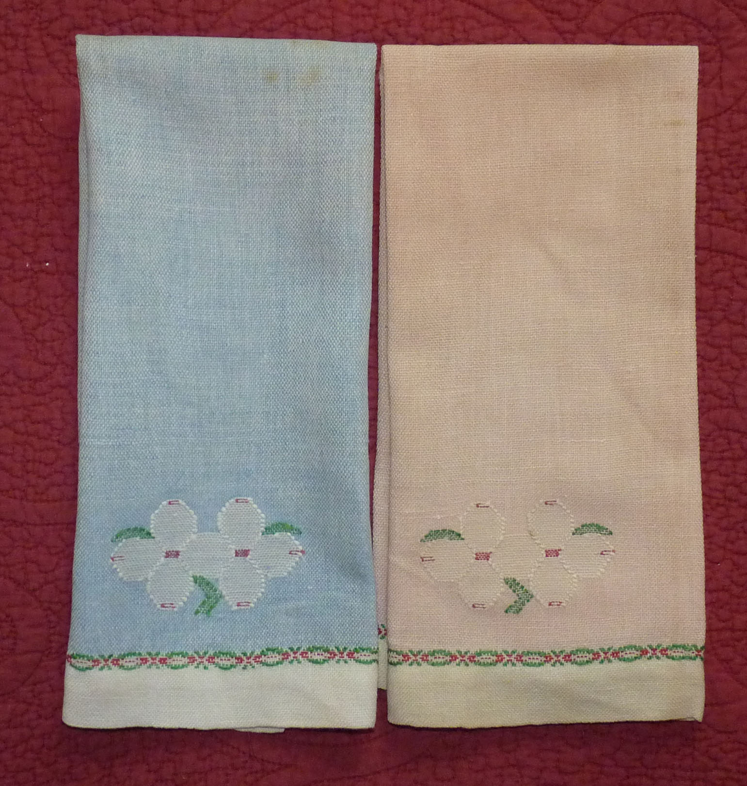 Handwoven towels. Weft inlay creates a little dogwood design.