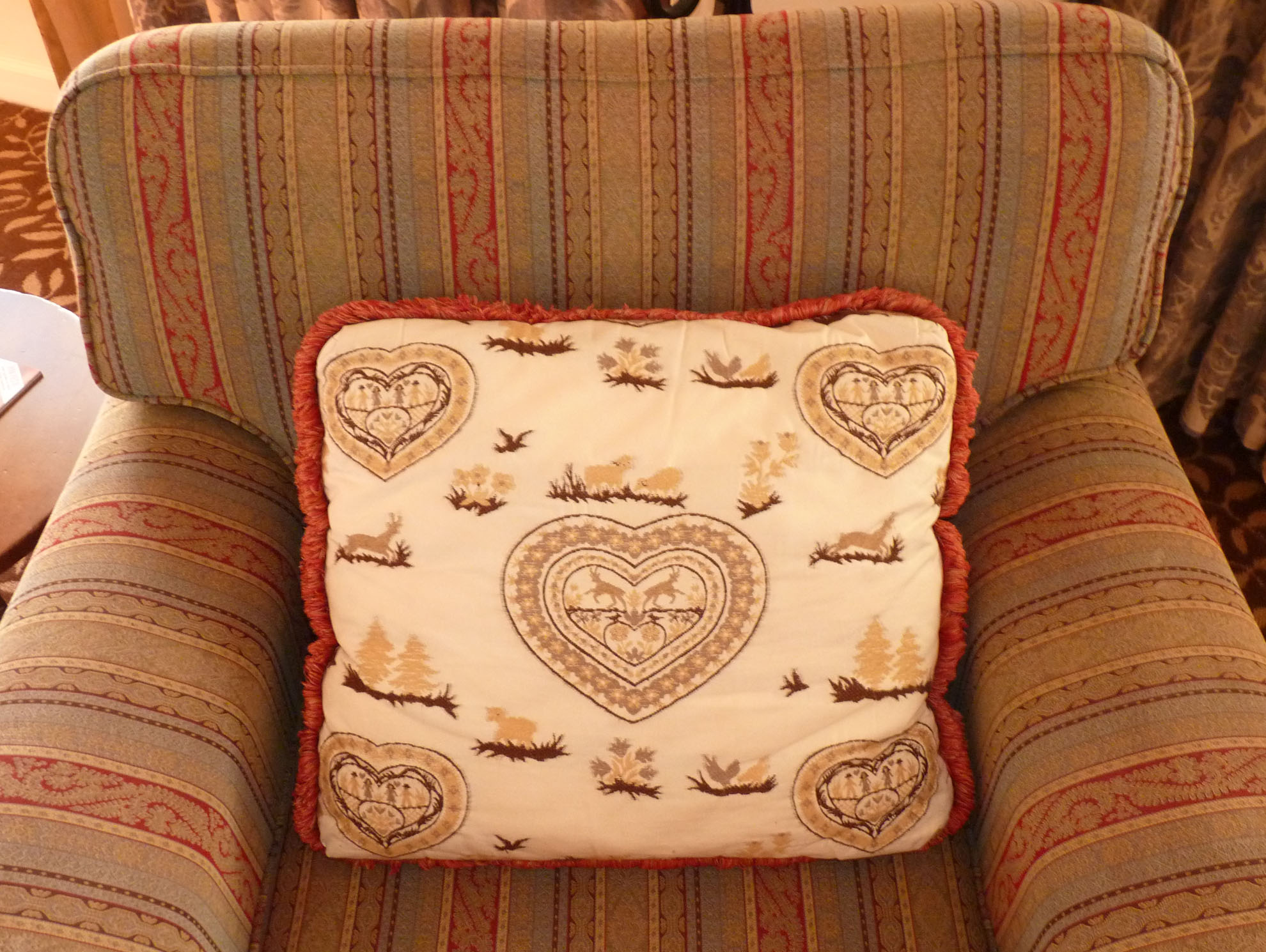 This chair ties together many of the colors in the room. This pillow has red trim too, and the design looks to be hand-embroidered…