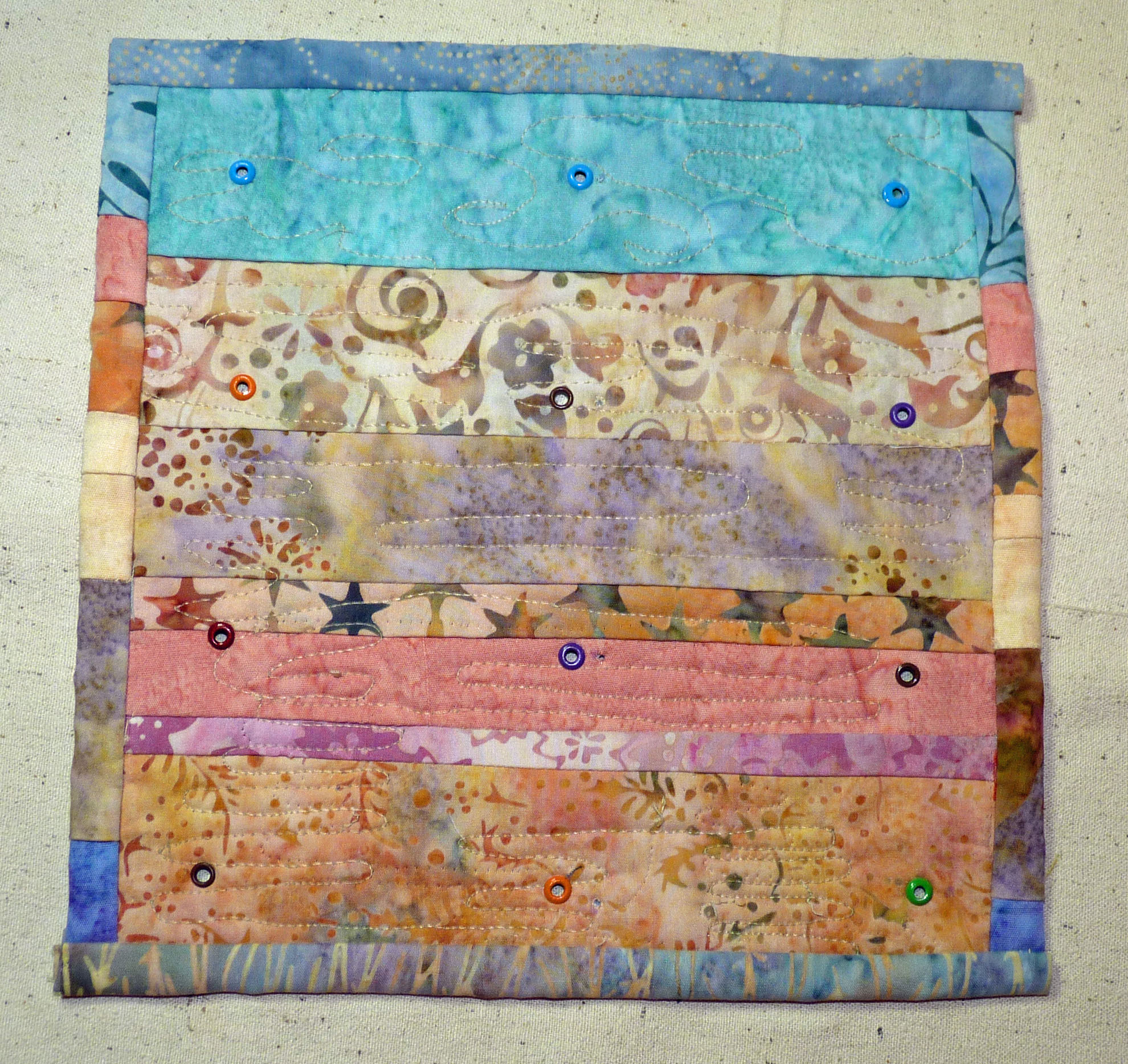 The base quilt with the eyelets set. I chose quiet batiks and plain cream thread for quilting, so those elements wouldn’t fight with the mini-quilts.