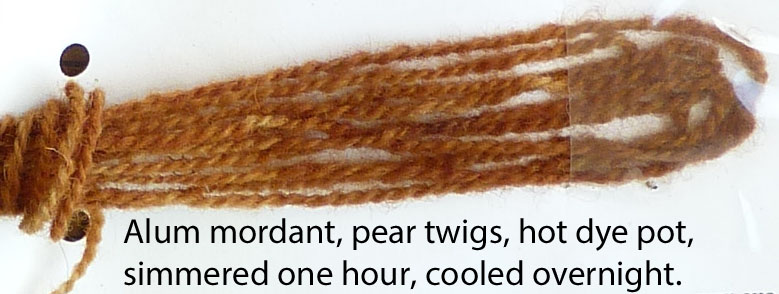 The pear dye was a lot of work – the twigs had to be soaked for days. But this is a nice rosy brown, so worth the work.