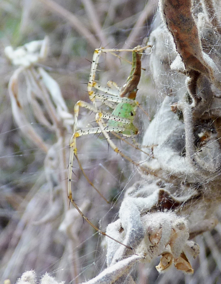 Green lynx spider on goatweed. If you look closely, you can see some of the baby spiders too.
