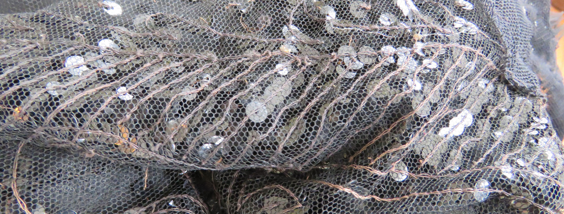 Detail, showing the chain stitching that holds the sequins to the tulle.
