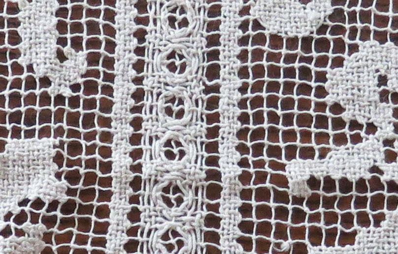 Detail of #1 – a knotted netting, with areas filled in with needle and thread.