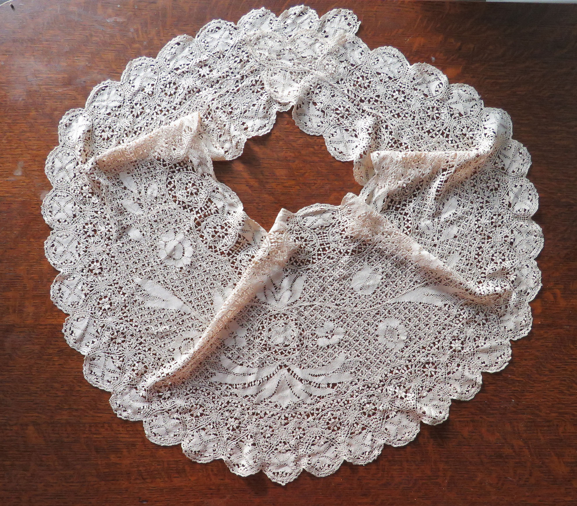 Silk scarf. It drapes beautifully on a person but does not lay flat well!