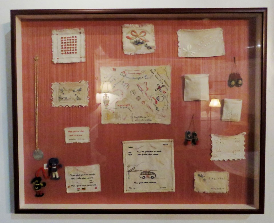 Embroideries done in secret by women prisoners in WWII, seen at the National Museum of the Mighty Eighth Air Force.