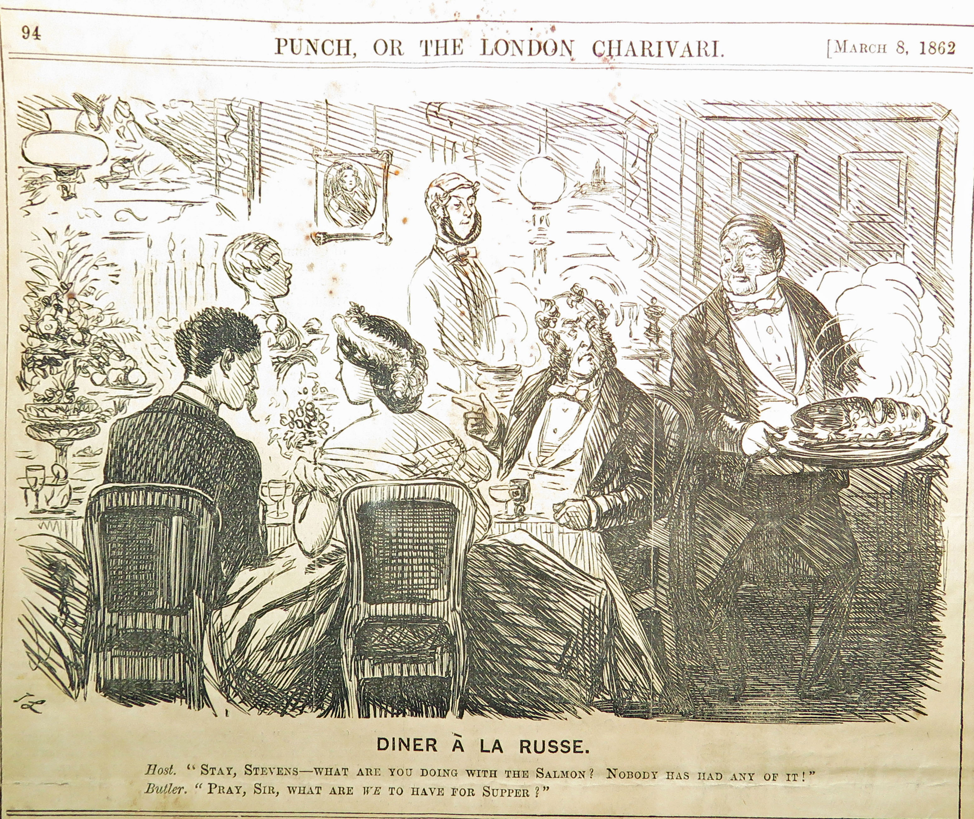 Diner a la russe: Host. Stay, Stevens –what are you doing with the salmon? Nobody has had any of it!” Butler: “Pray, sir, what are we to have for supper?”