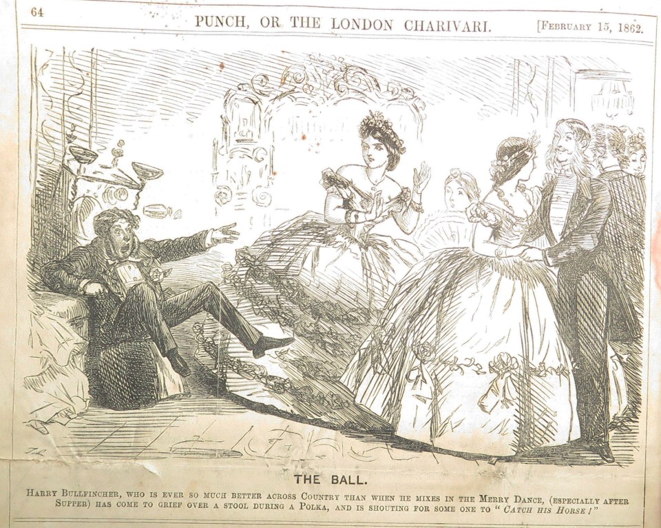 Harry Bullfincher, who is ever so much better across country than when he mixes in the merry dance (especially after supper) has come to grief over a stool during a polka, and is shouting for someone to “catch his horse!”