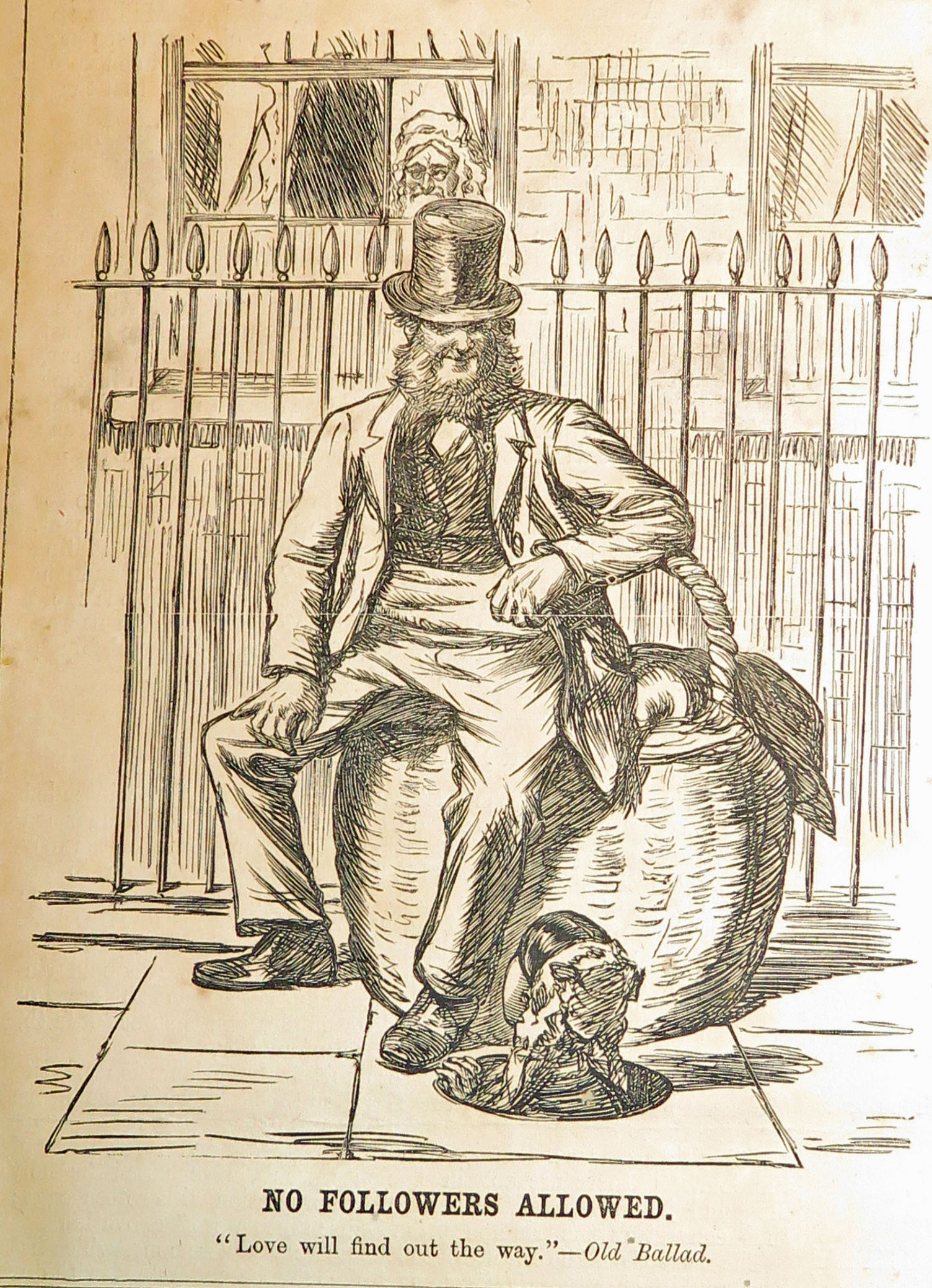 “No followers allowed.” Has the girl gone through the drain pipe to get to see her boyfriend? What is that giant basket he is sitting on? And will the old woman in the background tell on them?