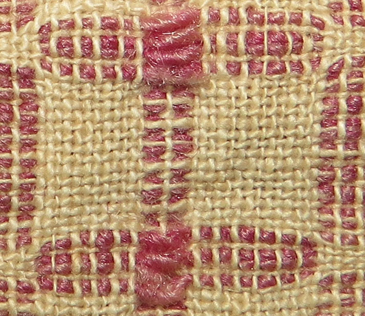 More evidence of the human touch — throughout the piece, the little white blocks on the left have 12 warp threads, and on the right they have 14.