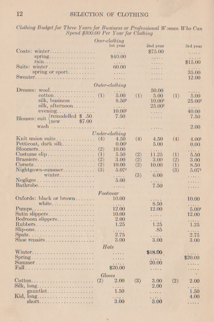 Suggested clothing budget from 1924. Four knit union suits per year!