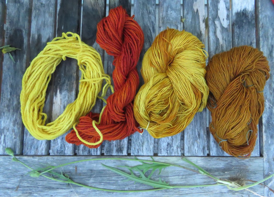 L to R – Licorice Twist yarn with dandelion dye, same with ammonia modifier, two skeins of Euro 6-ply sock yarn with dandelion dye.