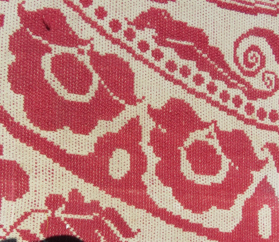 The abundance of curving lines shows it was woven on a Jacquard loom, rather than the simpler 4-harness looms that people had in their homes.