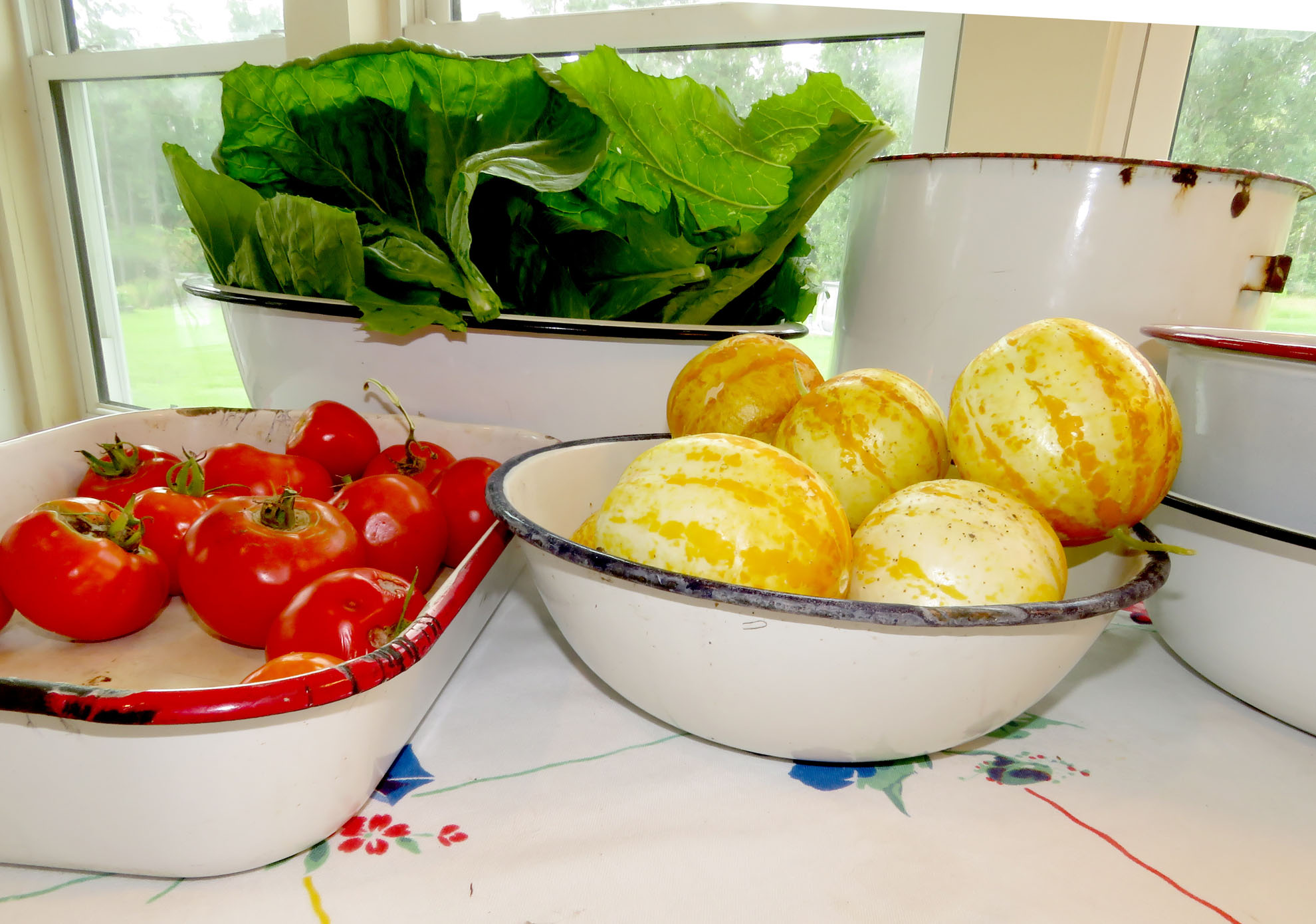 Mustard greens, cucumbers, and tomatoes in old enamel pans and bowls.
