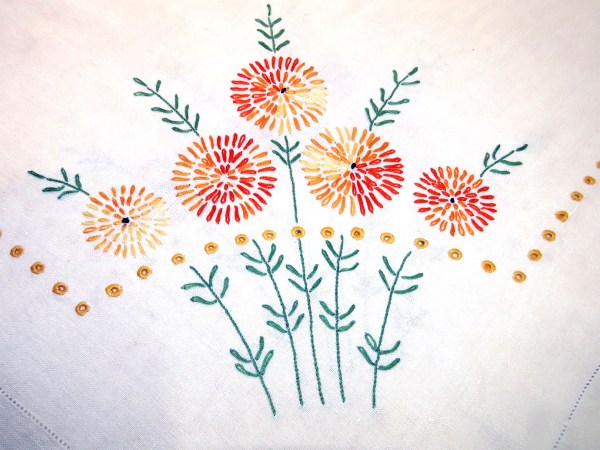 Love the tablecloths and napkins. My grandmother made many pillow cases in a similar flower pattern. I even learned to make the basic daisy pattern! Should have kept a sample so my children would believe that. Maybe not. They were sort of drunken daisies.