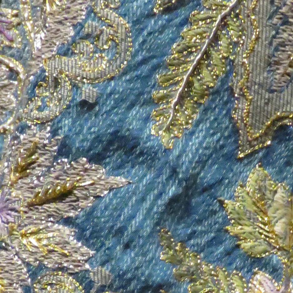 This is blurry, but it shows the blue silk twill underlying the embroidery.