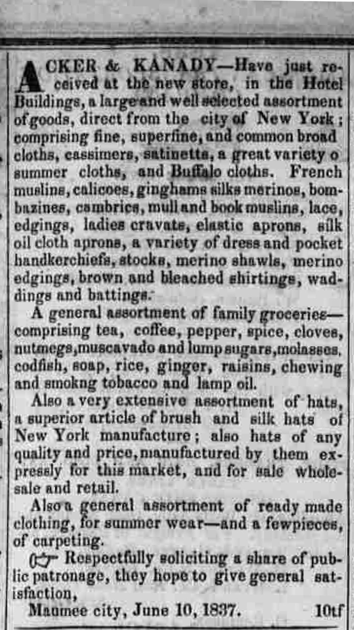 An ad for merchants in Maumee City, Ohio, 1837.