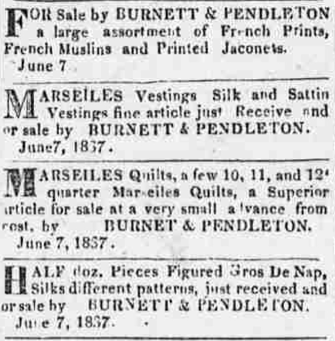 Ads from the Maumee Express, 1837, one advertising “Gros de Nap.”