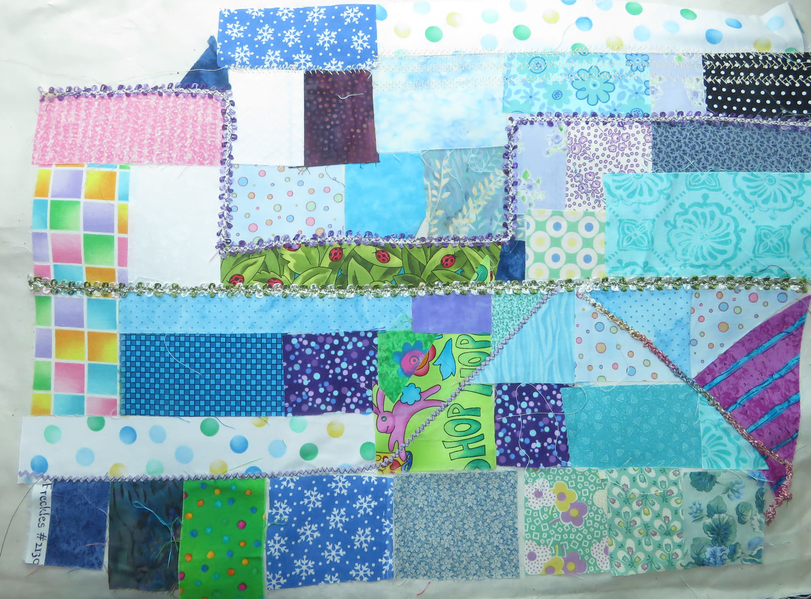 Fabric scraps fused and couched, before being painted.