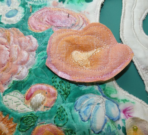 It’s wonderfully organic and I love the depth and shadow that the free standing pieces give to it. Gorgeous colour work, beautiful quilting… I agree it’s time to stop; you could end up putting in one too many details. It makes a beautiful sampler and stimulator of ideas.