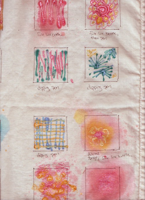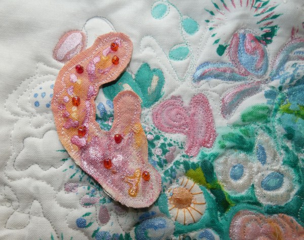 I tried two different techniques for adding lines and colors — quilting first on the blank white fabric, and then painting the color into the quilted shapes; and doing it the other way, randomly painting on fabric first, and then stitching around the painted spots and splotches. I think the second technique worked better for me. I wrote all the details about the process on the Endeavourers’ blog here.