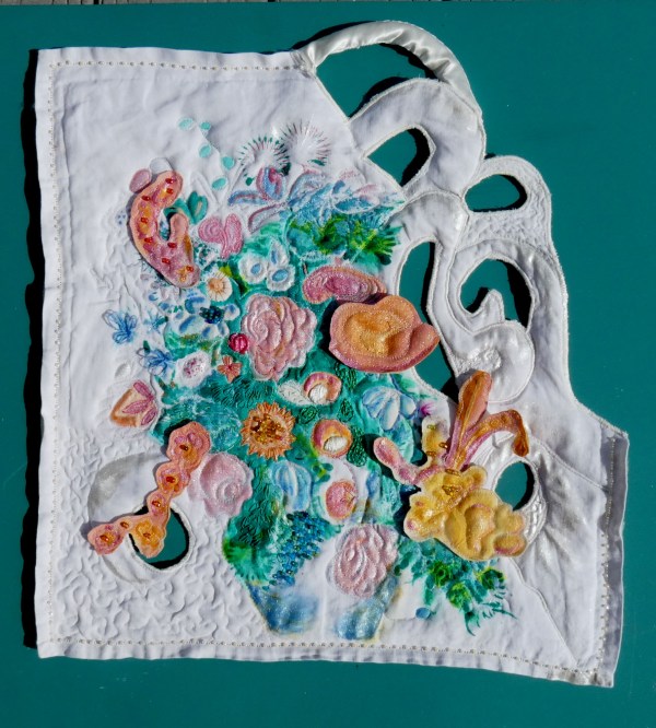 We have three months to make a small art quilt. I ran out of time to make my first, perfect idea, and turned to what I thought would be a quicker and easier idea — creating a flower still life with free motion quilting and fabric painting. I have used watercolor pencils and textile paints in the past, and this time I also tried acrylic inks.