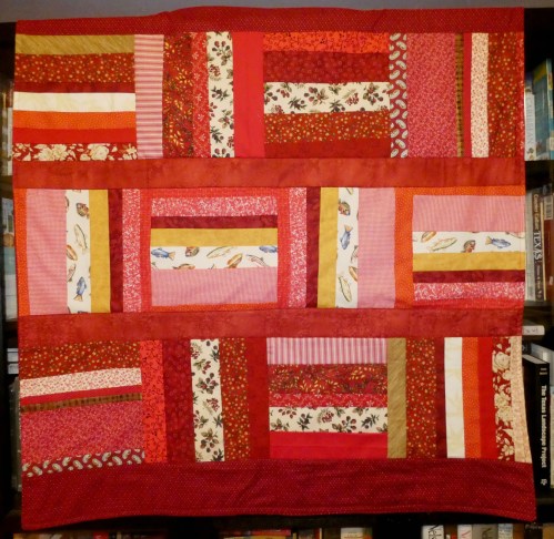 It’s been almost two years since I bought eight shoeboxes full of scraps (and a lot of big pieces, too) from my friend, Marilyn, who had to downsize. For this ScrapHappy project, I chose the box of red scraps and made a lap quilt for the VA Hospital. And then, since I had scraps scattered all over, I chose a second batch and made another! The flannel inside the layers was also scraps from Marilyn. And the pre-owned fabric I just got from Second Chance Fabrics was perfect for the backs.