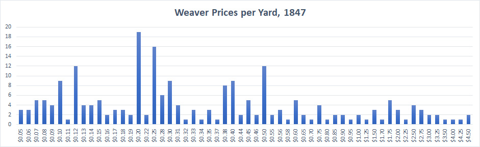 Number of fabrics in each price bracket, from the Weaver store in 1847.