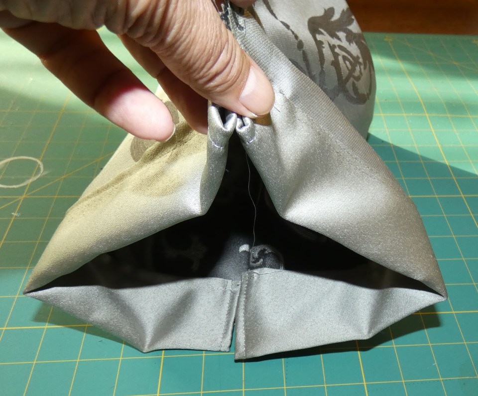 The side seam in your hand drops down toward the table, and the two unstitched sides of the bag widen and fold.