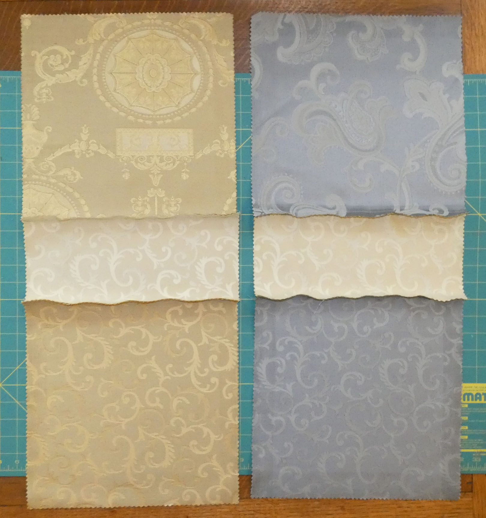 Two large squares with a rectangle in the middle, back sides showing the seams.
