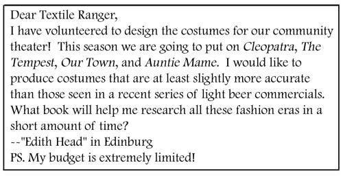 I think Cleopatra would look wonderful in pink polyester! Wonderful list here. I’ve probably mentioned before that my granddaughter is a theatre major specializing in costume. She has a lot to learn. I’d love to get her a stack of books but wouldn’t have known where to start. This helps a lot. Thanks from a true lover of advice columns!