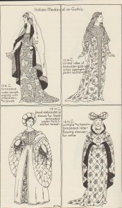 Here you go! You can scroll over the top of each illustration to see which book they come from. The red illustrations are from John Peacock’s Costume 1066 – 1990s — I find the black-lettered labels on top of the red line illustrations to be very distracting.