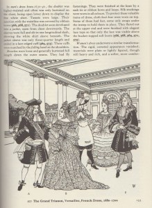 The Mode in Costume has beautiful line drawings of the various styles, without weighty source material. It was written and illustrated by R. Turner Wilcox, who was fashion editor for Women’s Wear Daily from 1910 to 1915. She wrote many books about costume. This one was initially published in 1942, and has gone through 64 editions!