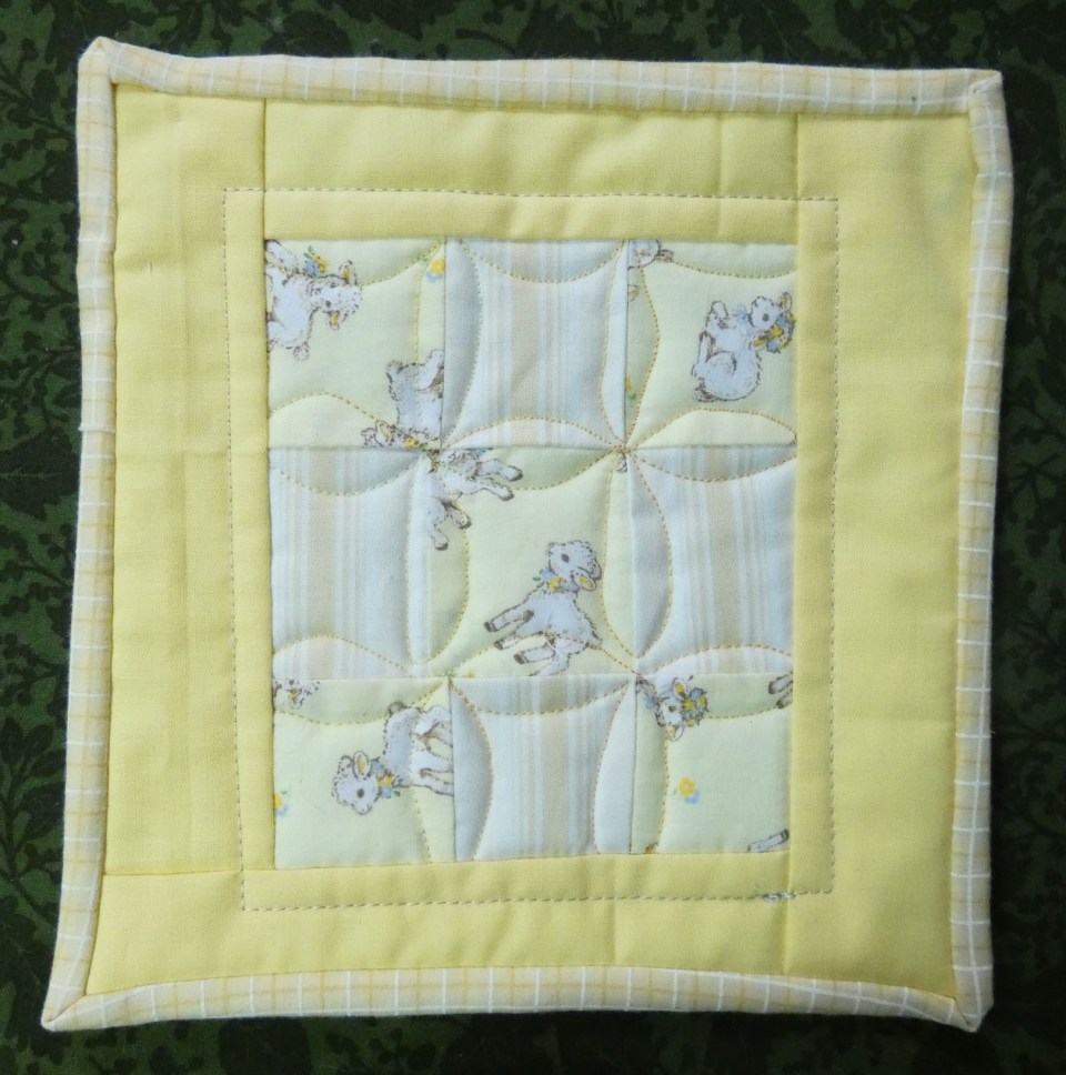 “Traditional” – A Nine Patch block with Orange Peel quilting and hand-stitched binding.