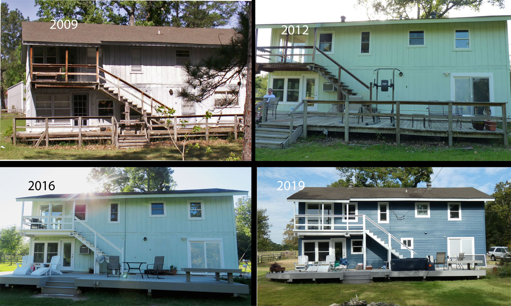 Top left: the house when we moved in, top right: painted but with old windows, bottom left: new deck, bottom right: new siding and paint.