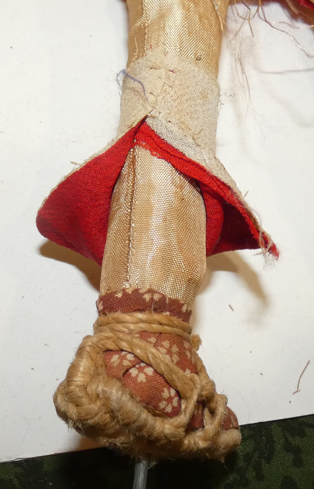 The leg wrappings are lined with a red silk crepe, that was never visible on the doll.