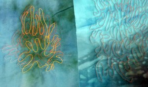 I used two layers of Warm and White batting in the quilt, and I really liked the way the stitches sunk in. To make the coral shapes, I did some free motion embroidery with 40-weight and 12-weight thread, and then I very lightly quilted some watery lines in the background.