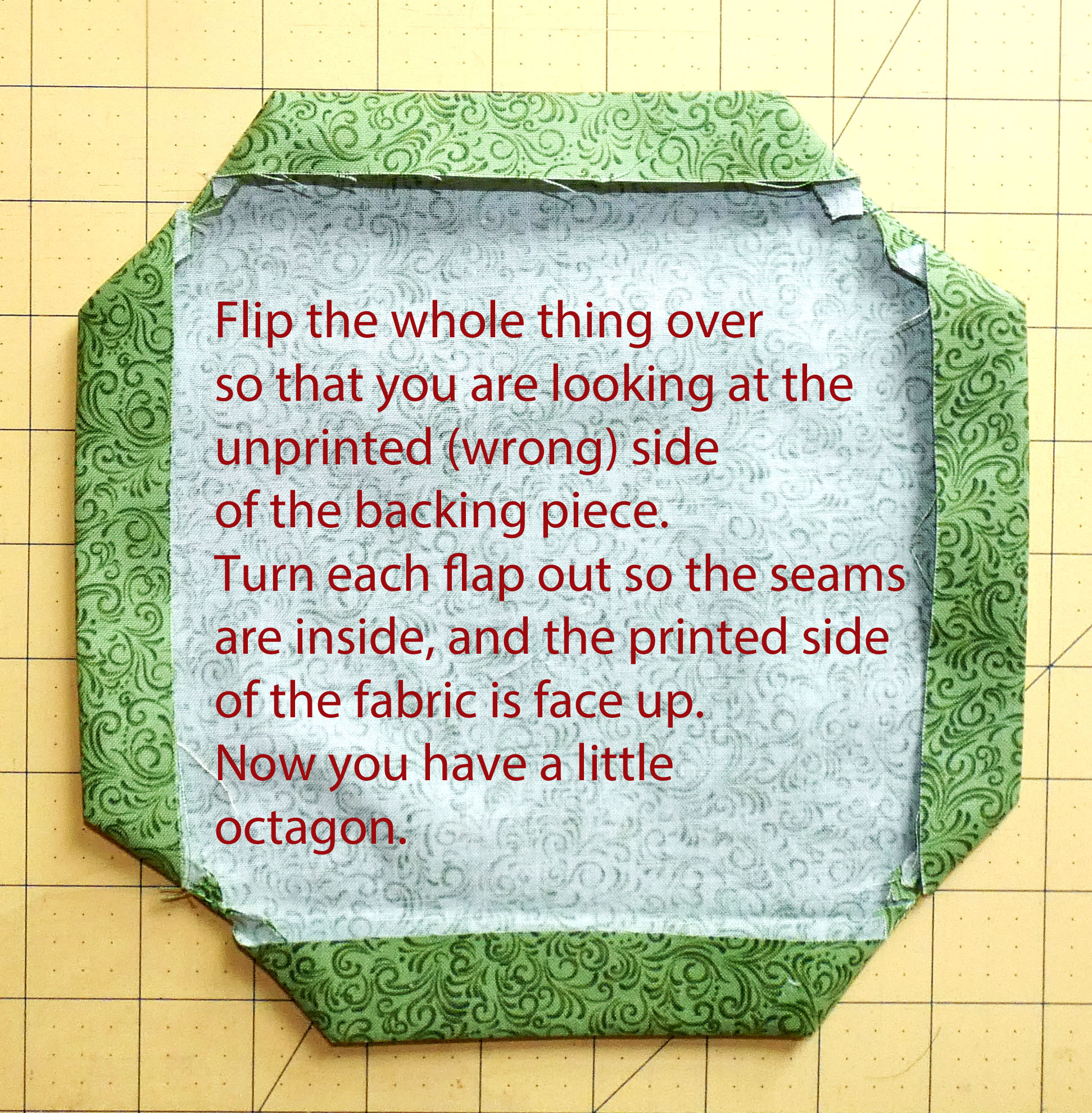 Step 5: Flip the whole piece over, turn flaps so seams are inside and right side of fabric is outside, making an octogon.