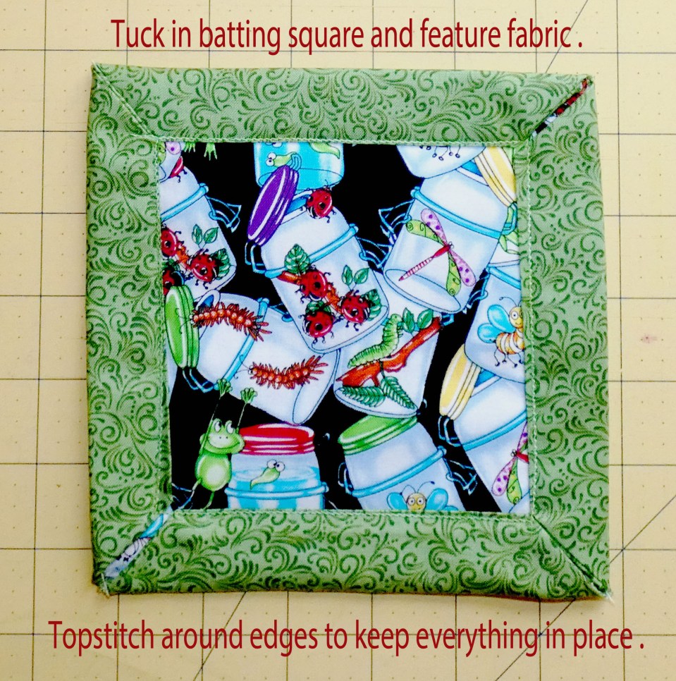 Step 7: Place batting square and feature fabric in the center, press, and topstitch all around.