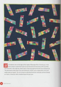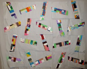 But I still had so many scraps left over! First I thought of making a border of scraps, but as I was moving the blocks around, it occurred to me to put all the leftover scraps in the center. Then the widely-spaced scrap strips looked like they were splintering off and flying away,