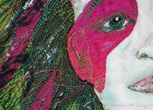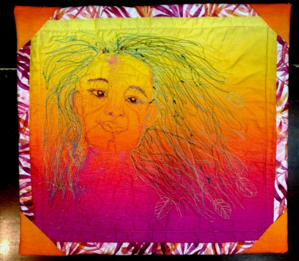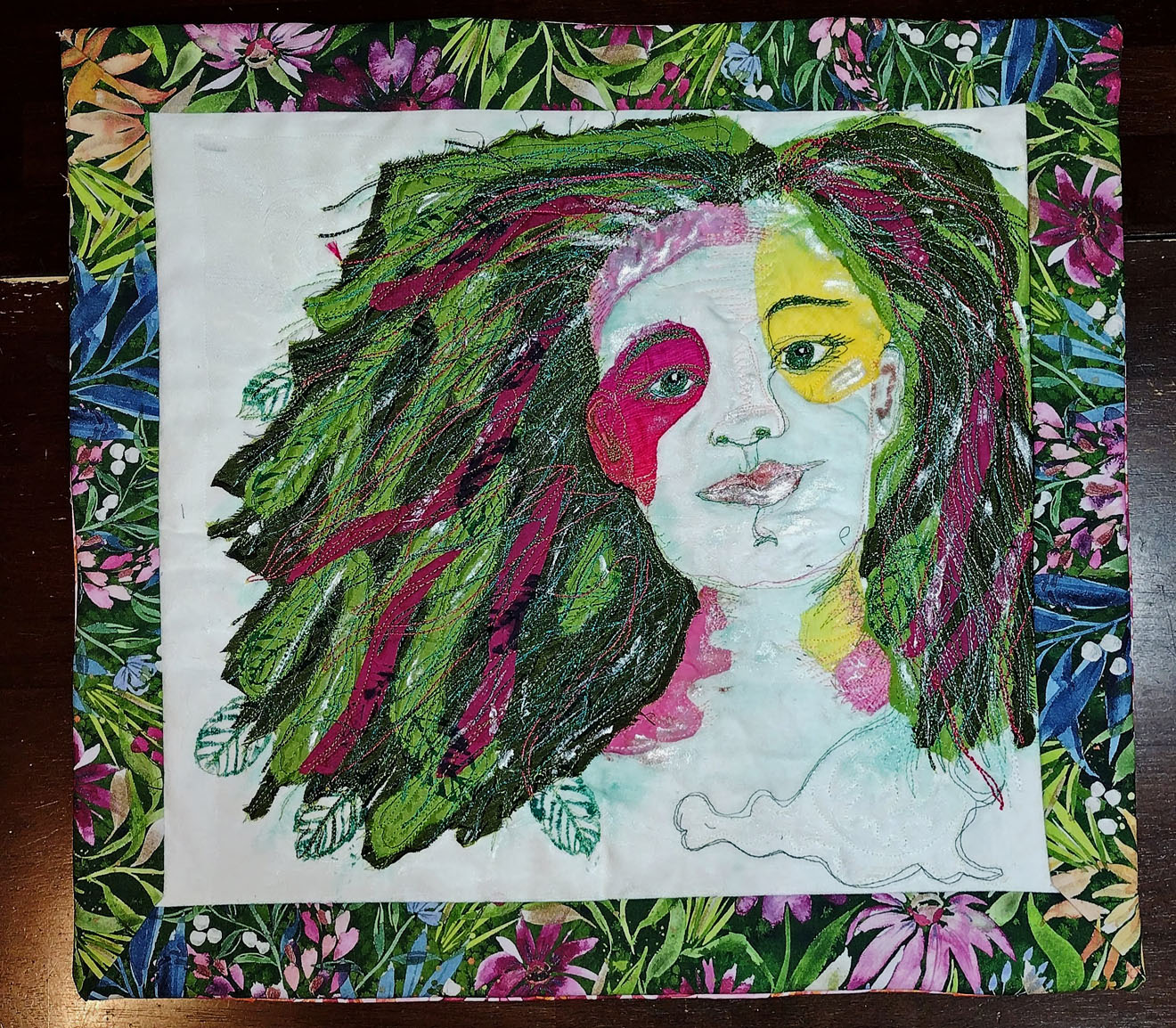 The quarterly challenge for this online art quilt group was “Portrait.”