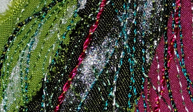 The heavy threads were put in the bobbin, and I stitched from the back with regular sewing thread, giving kind of a beaded effect.