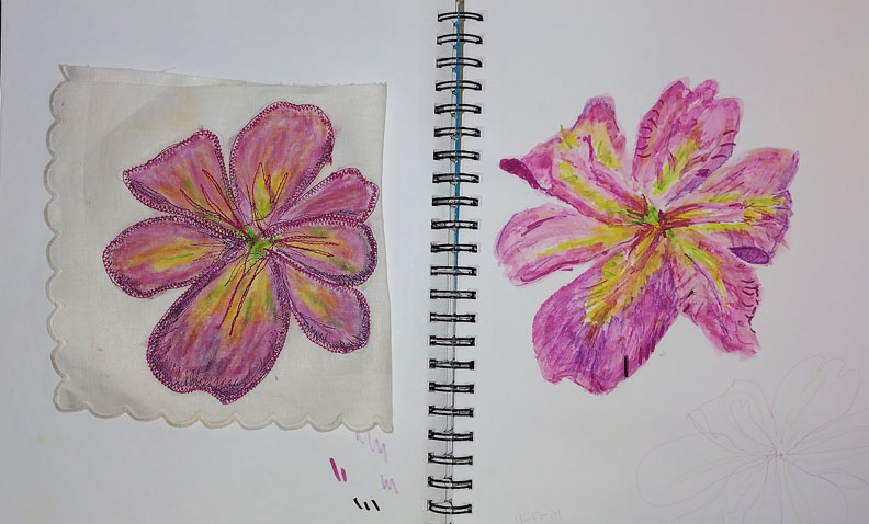 On the right is a colored pencil study of an iris, on the left is the same flower on Lutradur, colored with fabric crayons and stitched.